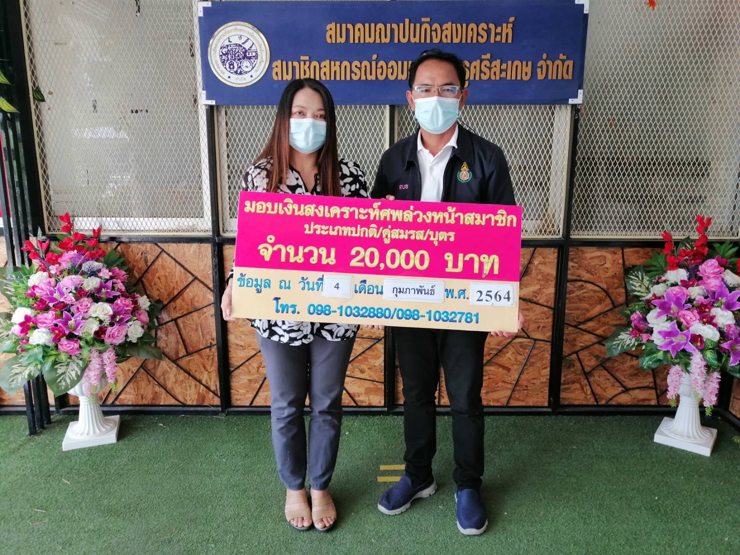สมาคม ฌส.ศก. มอบเงินสงเคราะห์ล่วงหน้าครอบครัว จำนวน 20,000 บาท ให้แก่ นางมลิจันทร์ บุญมา เลขประจำตัวสมาชิก สมาคมฯ เลขที่ ค.1351 สมาชิกประเภทปกติ โดยมี นายเกียรติวัฒนา บุญมา เป็นผู้รับเงินสงเคราะห์ครอบครัว
