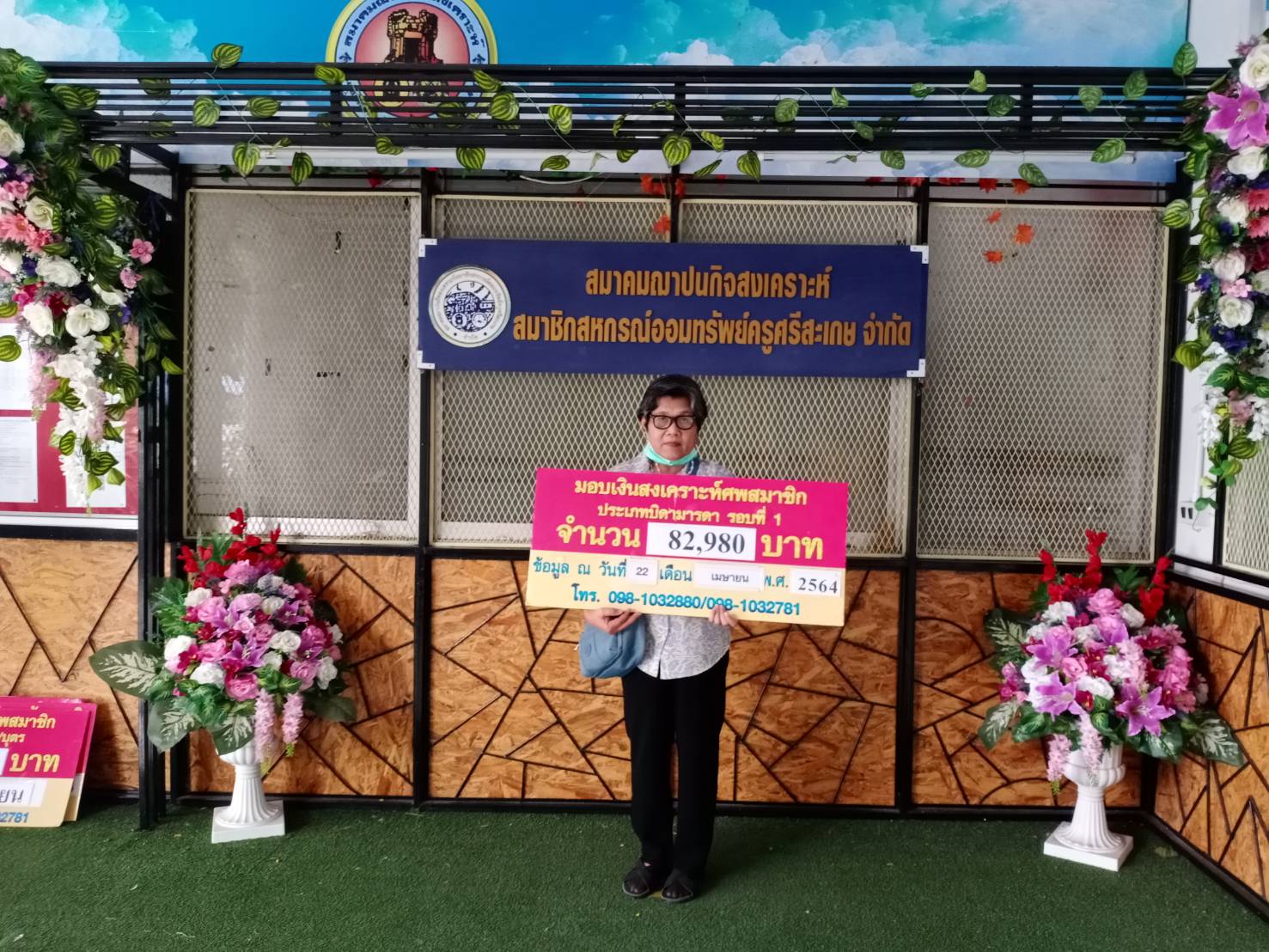 สมาคม ฌส.ศก. มอบเงินสงเคราะห์ครอบครัว งวดที่ 1 จำนวน 82,980 บาท ให้แก่นางคำปลิว วรพุฒ เสียชีวิตด้วยสาเหตุ ระบบหัวใจและไหลเวียนโลหิตล้มเหลว เลขประจำตัวสมาชิก สมาคมฯ เลขที่ จ.375 สมาชิกประเภท บิดา-มารดา โดยมีนางอุบล โคตร์ตะเป็นผู้รับเงินสงเคราะห์ครอบครัว